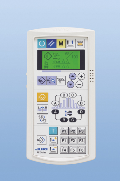 Sewing data can be input and programmed with ease on the operation panel. The number of pieces of sewing data that can be stored in its memory is 99 at the maximum. Setting and selection of all sewing data can be done on the operation panel. Data items are displayed in easy-to-understand pictographs on the LCD. As many as 99 different patterns of sewing data can be stored in its memory. one sewing pattern can be divided into 10 sections. For the respective sections, the number of stitches, top and bottom differential feed, and upper and lower manipulator pressures can be numerically input.