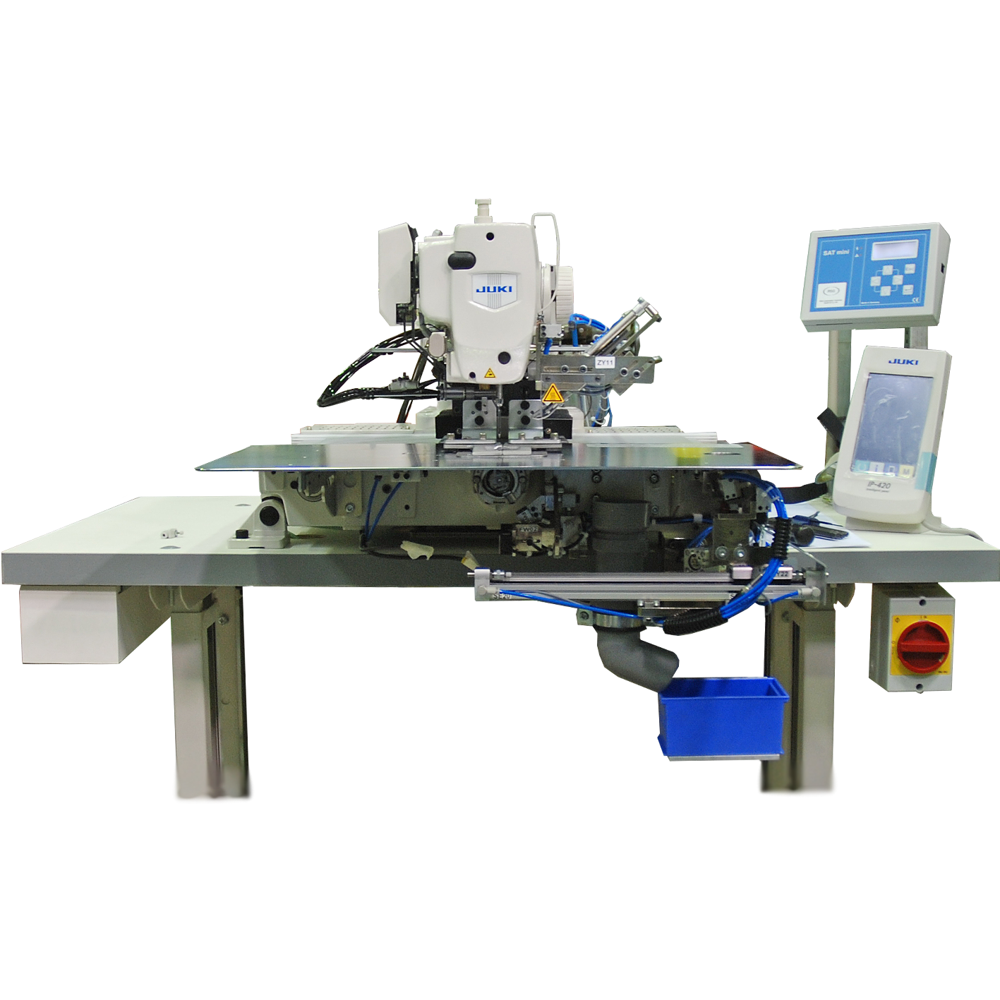 Newly developed optional attachments for JUKI’s AMS Series Improve the machines ease of use as well as combining to increase productivity. The attachments equiped onto this machine include: Thread Heat Trimmer; Automatic Bobbin Changer; Bobbin/ thread sensors and a thread puller. These optional attachments were developed with the cooperation of RSG Automation Technics GmbH. & Co. Full machine code: AMS- 221ENHL2516SZ5000NSD- RSG1