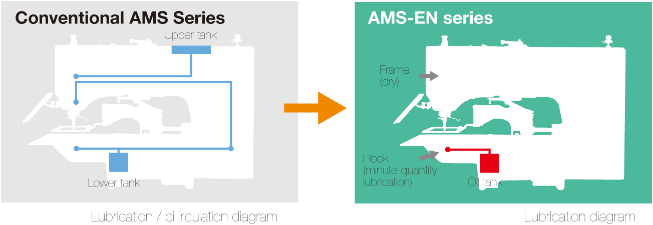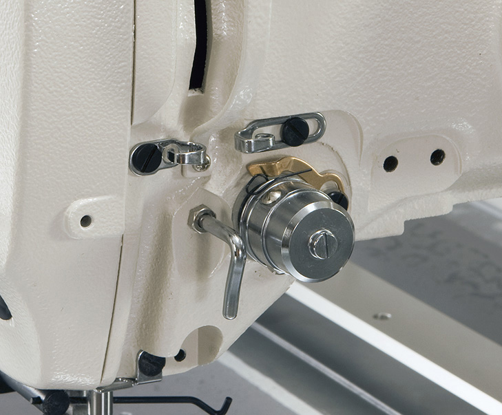 The frame (needle bar unit and thread take-up unit) is lubricated with grease, and the hook is fed with a minute quantity of oil from the oil tank. JUKI’s advanced dry technology, which is utilized in a number of our sewing machine models, protects your products from being stained with oil.