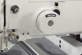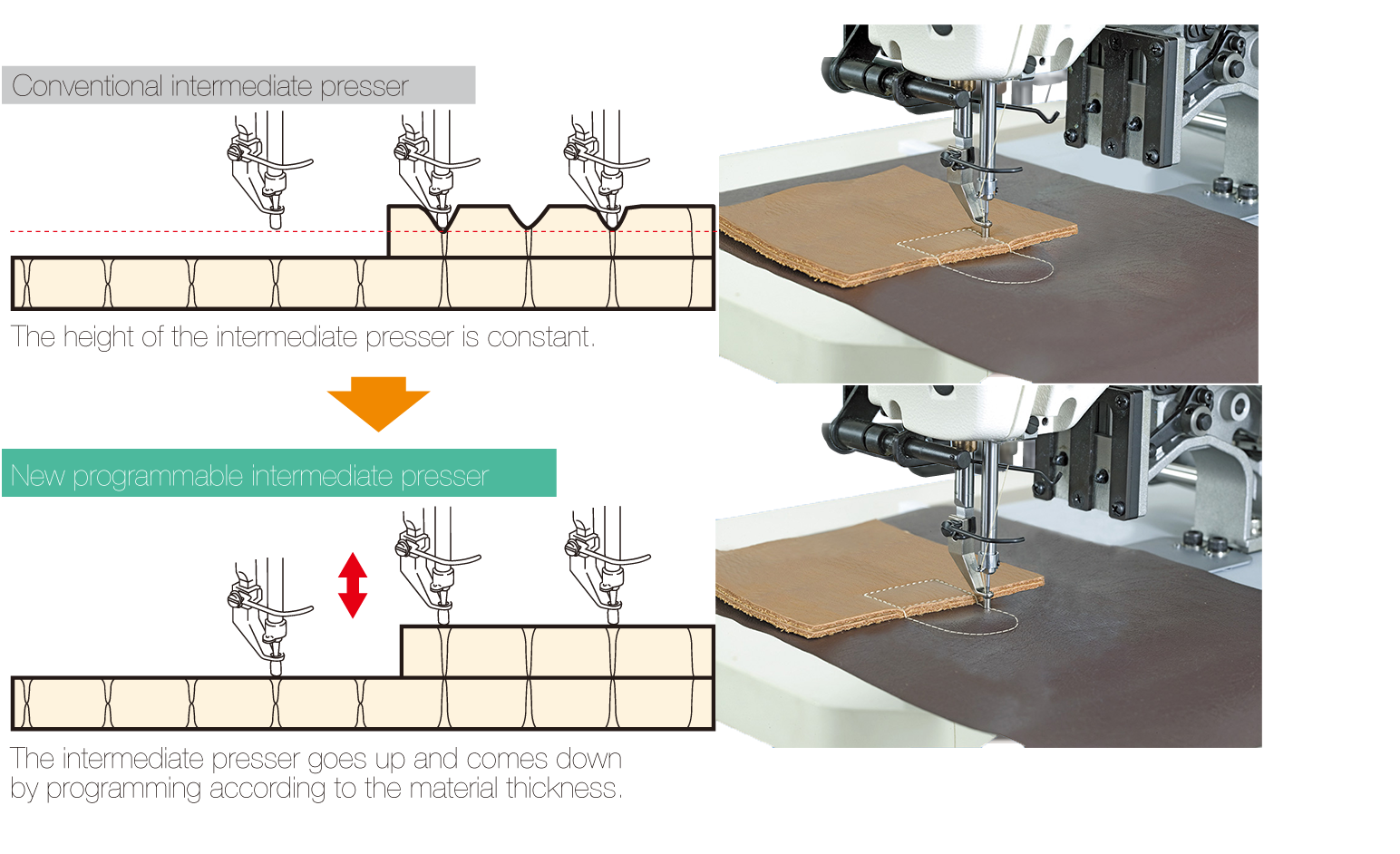 With the programmable intermediate presser, the height of the lower dead point of the intermediate presser can be set according to the material thickness, thereby not only preventing troubles in sewing such as stitch skipping and thread breakage, but also protecting the sewing product from being damaged by the presser. The height setting can be changed with ease even during sewing. The machine finishes beautiful uniform seams free from stitch skipping even on multiple parts of the material by the ideal combination of the active tension and programmable intermediate presser.