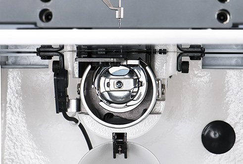 The full-rotary hook contributes to the achievement of soft-texture beautifully-finished seams which are required for bags and leather products. In addition, the bobbin case opening lever is adjustable not only laterally but also longitudinally, thereby enabling accurate positioning of the bobbin case according to the needle count.
