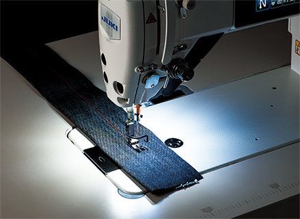 The LED light illuminates the needle entry area in the just-under direction from the right and left sides of the needle bar. In comparison with the single-direction illumination, this LED light helps the operator carry out sewing more easily. Illuminance of the LED light is adjustable in five levels. It can also be used as an auxiliary lamp for working.