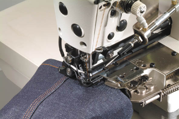 The cylinder-bed lockstitch machine with a thread trimmer is designed for hemming the bottom of jeans, casual pants and work uniforms.