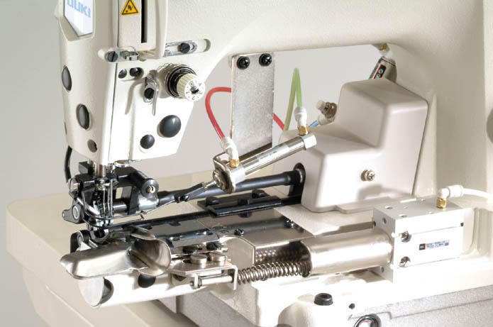 ● The machine employs a highly reliable horizontal thread trimming mechanism which cuts thick thread without fail. ● The entire knife unit can be installed/removed. ● The moving knife position can be easily adjusted. ● The knife unit is of a bed device type. This means that adjustment of the knife unit is not required after removing the throat plate. ● Every time that operation of the thread trimmer occurs, the air blower keeps the knife clean by blowing off thread chips from the blade, ensuring the reliable operation of the thread trimmer.