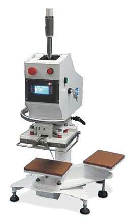 Easy in use transfer press with heating area 20x15cm is equipped with large color touch-screen, responsible for setting up temperature and time of pressing. Pressure is set manually. The press is lowered by simultaneous pressing of two buttons (protection against putting the hands under the press) or through the control pedal, supplied as standard with the machine.