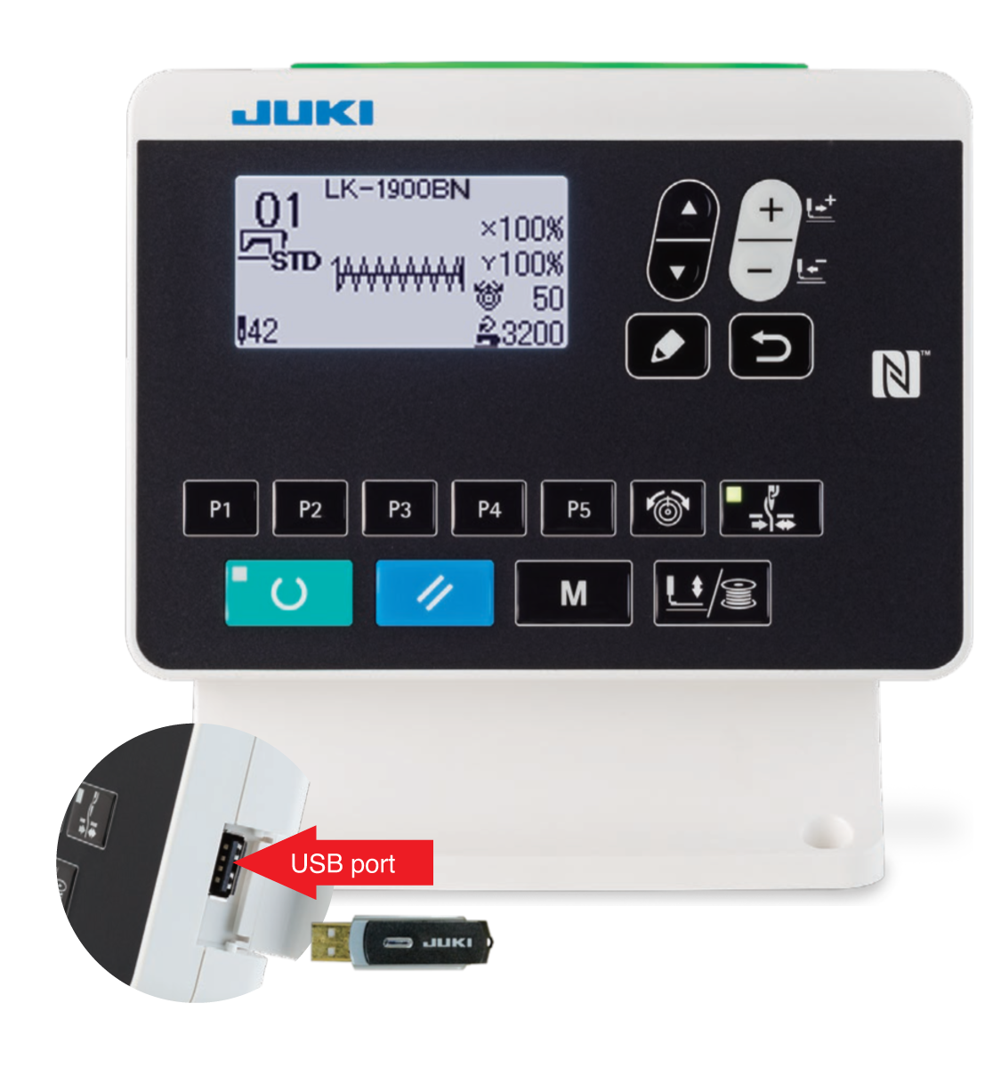 Data on sewing machine adjustments made according to the product to be sewn can be transferred to a commercially-available Android tablet in contactless mode. This enables quick check for uniform settings as well as confirmation of conditions of sewing machines in a sewing line, thereby facilitating setup changes.The operation panel is also provided as standard with a USB port. Data management and software update can be carried out with ease using a USB thumb drive. Data items of sewing can be numerically managed to ensure "stable quality" and "reduction in time required for setup changes".Quantified sewing data can be externally taken from the sewing machine using an Android tablet or USB thumb drive.