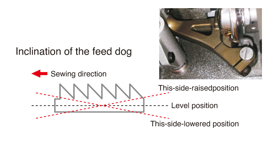 The adjustable range of the feed mechanisms has been widened, thereby upgrading the machine's responsiveness to materials The feed mechanism has been improved by widening the adjustable range of the height and inclination of the feed dog. The feed locus has been optimized while placing great emphasis on the feed locus at the moment the needle penetrates the material to form a stitch. The weight of the feed mechanism has been reduced by using parts most of which are made of aluminum material. This facilitates sewing of overlapped sections of material that have to be securely held between the presser foot and the feed dog during sewing.