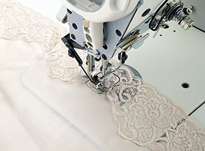 The machine incorporates a built-in lower knife that trims only the lower material. This allows the machine to simultaneously attach lace to the body of the foundation and trim only the body during processes to attach lace to the bottoms or tops of slips or to the joint seam lines of shorts.