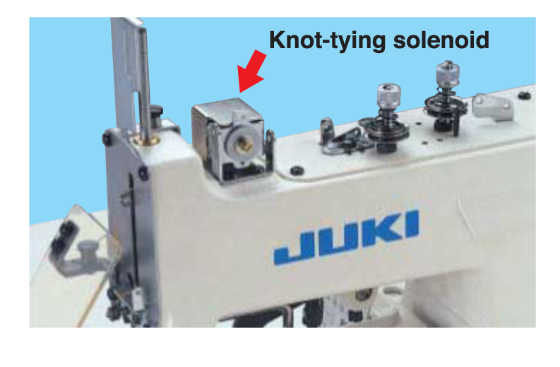 The machine comes as standard with the solenoid-operated, thread-tension-changeover “thread-fray-prevention function.” Since the machine is designed to use a long needle (TQ×7), the “thread-fray-prevention function” can be used for sewing shank buttons.