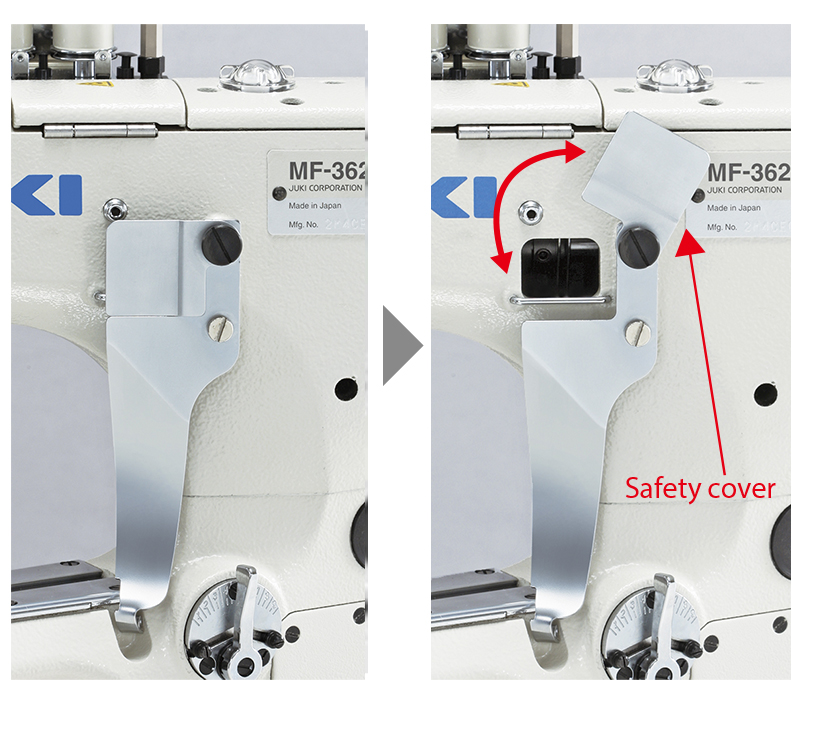 Safely within its new shield, the frame is equipped with mechanisms for micro-quantity lubrication and forced oil circulation. The thread take-up mechanism arranged on the outside of the arm prevents the entry of oil splashes and dust. The frame is shielded and equipped with mechanisms for micro-quantity lubrication and JUKI's unique forced oil circulation.The thread take-up mechanism arranged on the outside of the arm prevents the entry of oil splashes and dust. The MF-3620 is also configured with JUKI's unique oil-thrower mechanism to protect the looper section from oil infiltration. Excess oil is speedily reclaimed via the new oil groove.