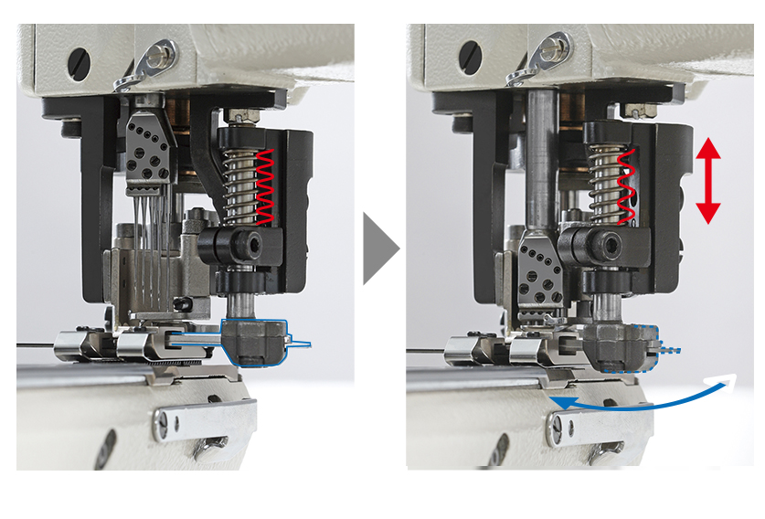The presser foot of the flat seamer is a special one in which a cloth cutting mechanism is installed. This special presser foot has been originally designed by JUKI, making the most out of its technology. The presser foot ensures a smoother feed of the material and helps reduce the load applied to the material. (In addition, the service life of the cloth cutting knife is lengthened.)