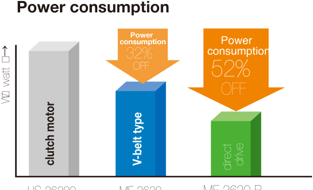 A servomotor is installed on the direct-drive type sewing machine. The new machine consumes only about half the power of the conventional models. The enhanced responsiveness (compared with the model equipped with the clutch motor) of the MF-3620 gives the operator complete control over the material when sewing curved sections. A servomotor is installed on the machine head for adopting the direct-drive mechanism. The power consumption has been reduced by approximately 52 % as compared with the conventional model. Since the sewing machine provides superb responsiveness, the material can be controlled as desired when sewing a curve part. In addition, the belt-drive type sewing machine (when a servomotor is used) has also had its power consumption reduced by 32 %.