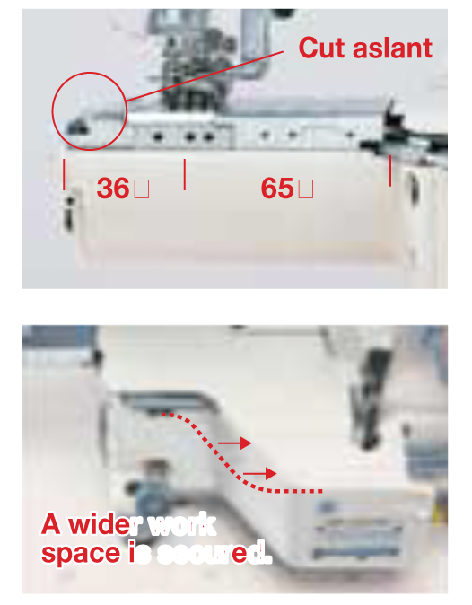 Since the top end of the cylinder bed has been cut aslant, placement/removal of the material on/from the sewing machine is carried out with ease.