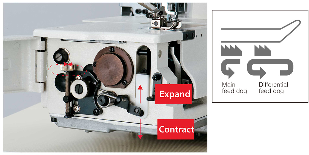 It is possible to finely adjust the differential feed amount to a best-suited value for the material to be used. The differential feed ratio is constant even if the stitch length is changed.