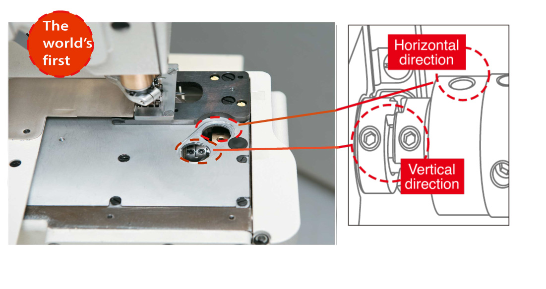 The longitudial position of the feed is adjustable. As result, uneven material feed and puckering that are likely to occur when sewing products made of elastic materials such as fundations are reduced. This means that the machine promises improved responsiveness to elastic materials.