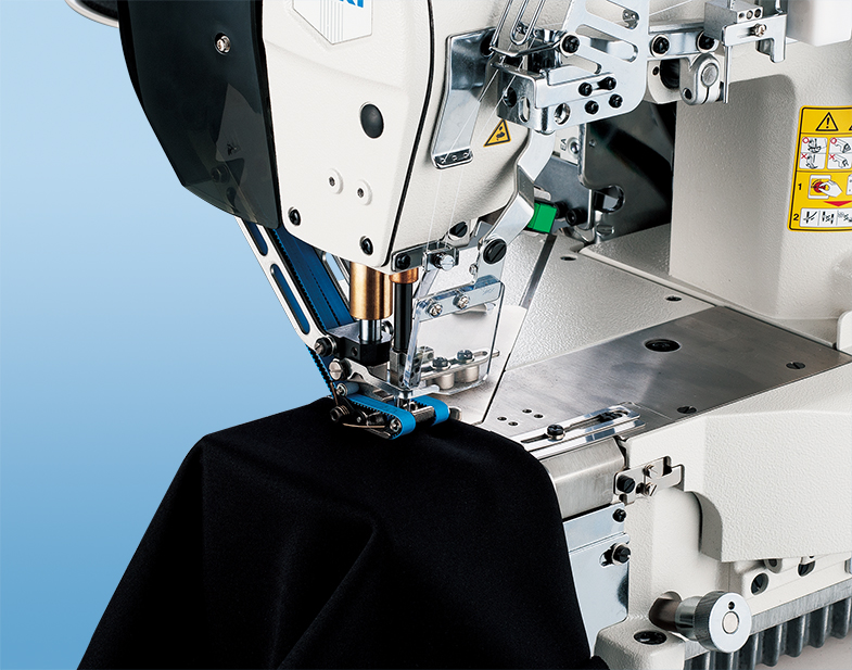 The machine us provided with the digital type top feed mechanism. This mechanism prevents problems, such as twist of fabric, uneven material feed, skew of grain and stitch gathering on multi-layered sections of material, which are likely to occur when sewing elastic material, thereby achieving stable seam quality.