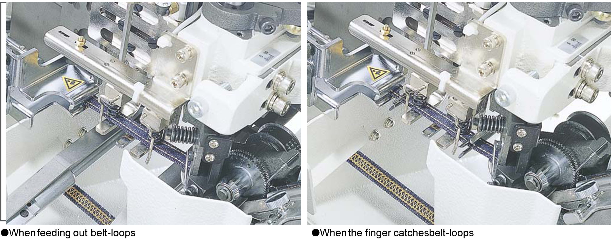 Belt-loops are fed out by the conventional gear-roller feeding mechanism and also drawn out by the new drawing mechanism on the clamp device. Supported by these two mechanisms, the folding fork catches “curled” or “creased” belt-loops every time and supplies them to the head. In addition, the sensor of the clamp device detects the presence/absence of belt-loops. If it detects a faulty belt-loop feed, the clamp device automatically repeats the clamping action. Since the operator doesn't have to operate the set-back switch, less time is lost.