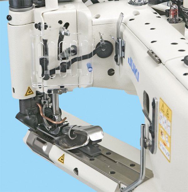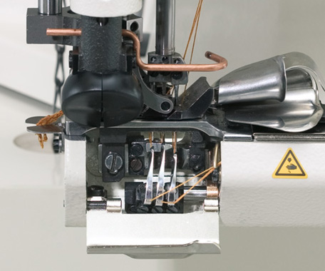 This machine demonstrates increased feed efficiency to handle extra heavy weight 16-ply denim. Engineered with extra feeding strength for seaming the inside of jeans. The machine is best suited for lap seaming jeans, denim jackets, work uniforms, etc. constructed of heavy weight materials.