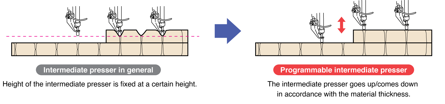 The dry head machine achieves max. speed 3,000sti/min with supporting various sewing and materials.